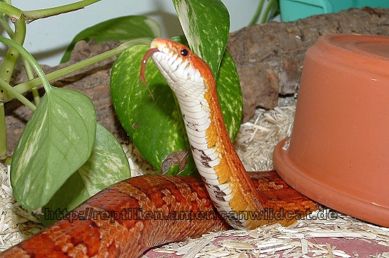 - elaphe guttata guttata - - Lebensraum Süd- Osten der USA, in Wäldern, Steppengebieten und ,wie ihr Name bereits verrät, in der Nähe von Feldern - ihre Körperlänge liegt zwischen 90- 140 cm - ihre Nahrung besteht aus Mäusen und jungen Ratten - im Terrarium sollte am Tage eine Temperatur von 26- 28 C° und in der Nacht 18- 22 C° - die Luftfeuchtigkeit sollte zwischen 60%- 70% liegen, auf tägliches sprühen sollte man nicht verzichten - das Terrarium sollte höher als breit sein und mit Kletterästen, Hölen und einer Badestelle eingerichtet sein |